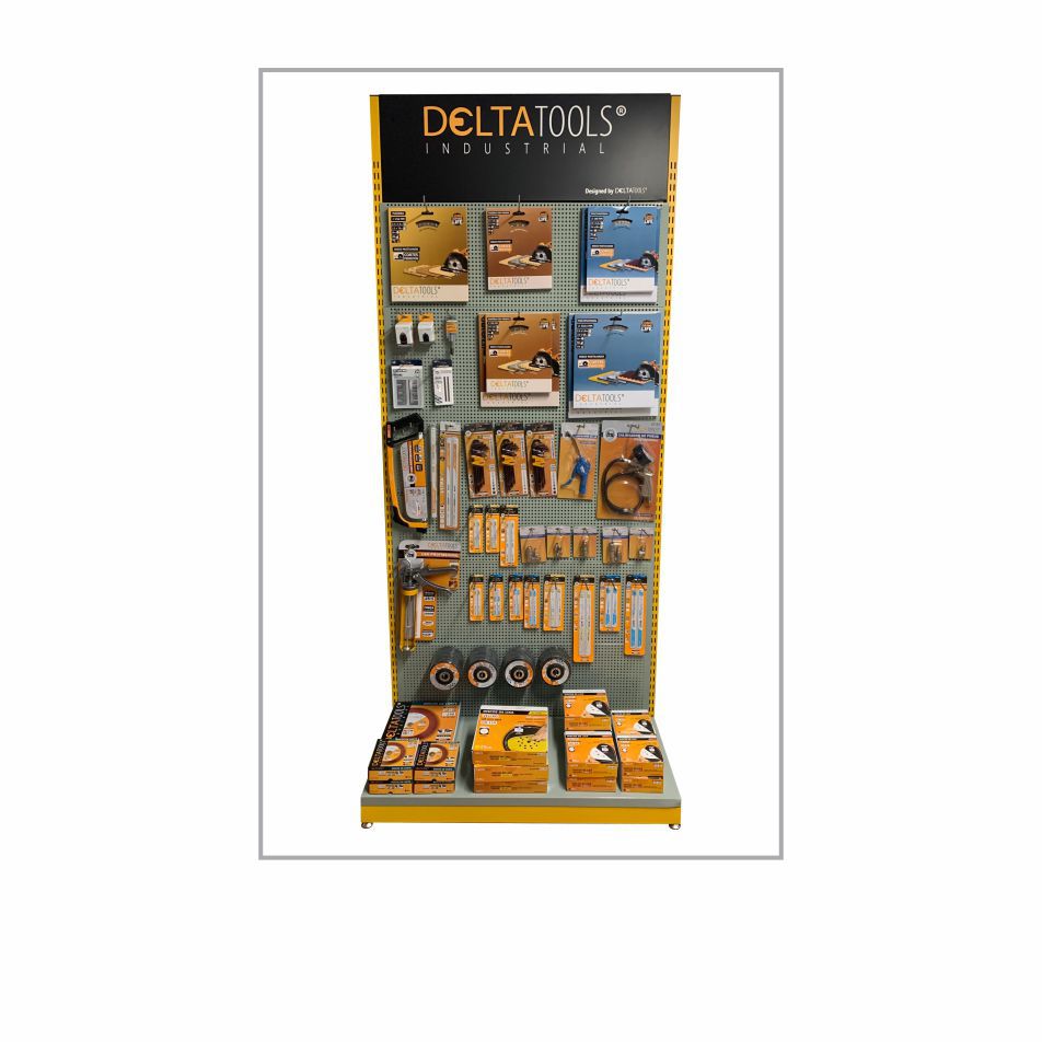 Expositor Multiprodutos DELTATOOLS, Expositor com diversas categorias de produtos.
