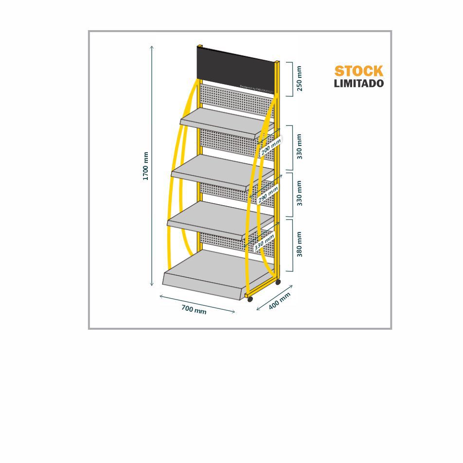 Expositor com 4 prateleiras para destacar Displays e rodas para maior mobilidade.