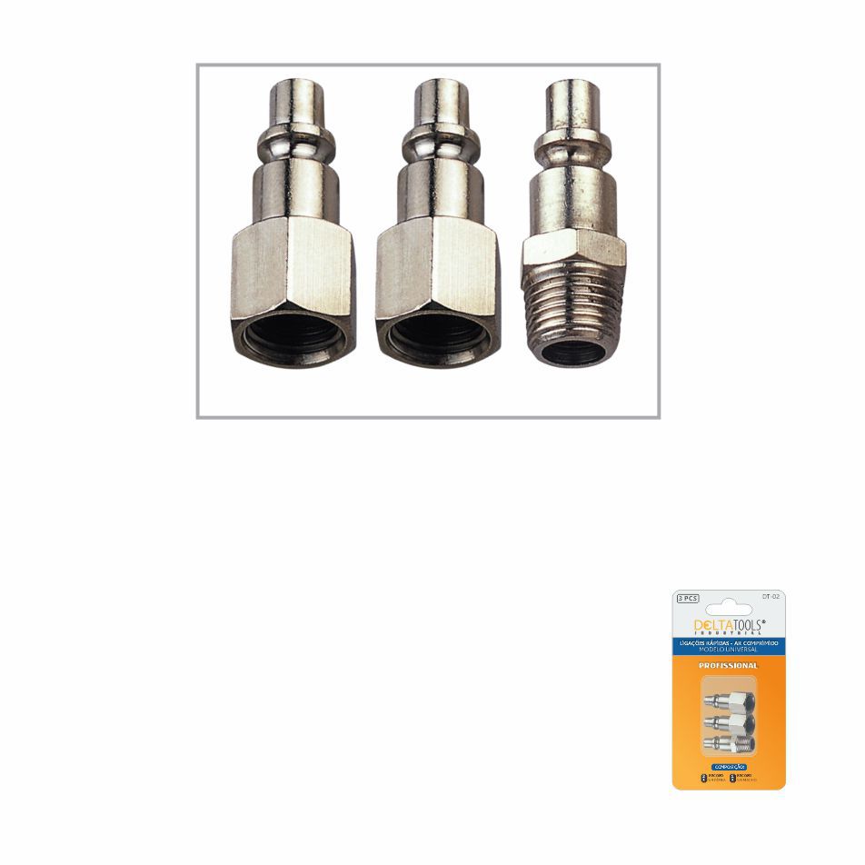Modelo universal DT-02 – indicados para todos os tipos de equipamentos, máquinas e instalações de ar. Composição: 2 Record 1/4 Fêmea e 1 record 1/4 Macho.