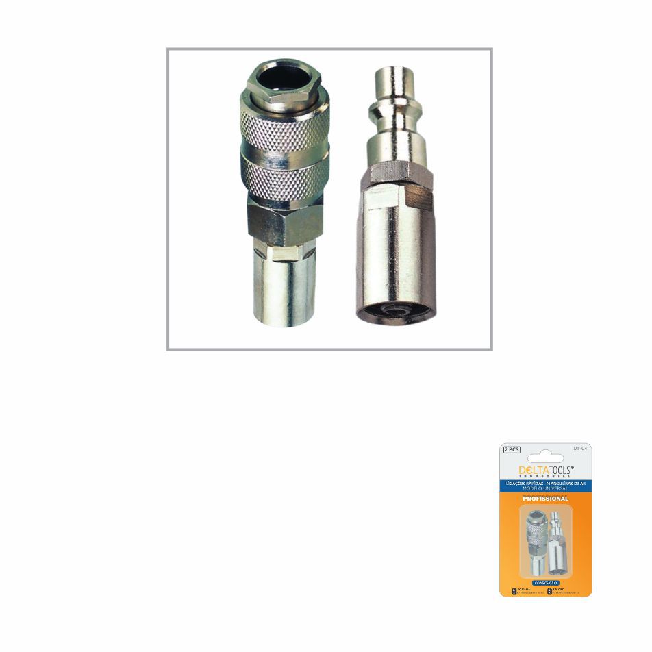 Modelo universal DT-04 – indicados  para todos os tipos  de equipamentos, máquinas  e instalações de ar.  Composição: 1 tomada p/mangueira 8/15 e 1 record p/mangueira 8/15.