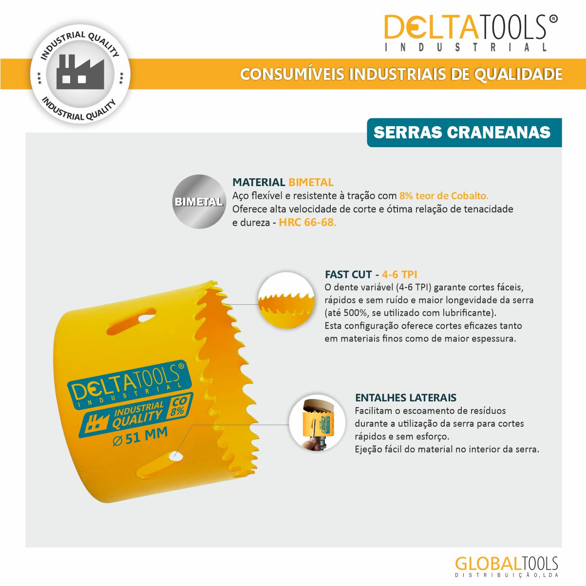 Serras craneanas Bimetal com 8% de cobalto ideal para aço Inox e ejeção fácil do material.